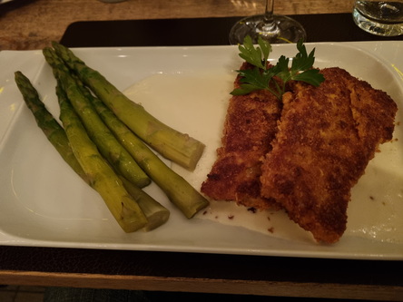 an Pernodsauce mit grünem Spargel und Salzkartoffeln