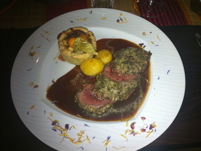 Springbockfilet in Salbeikruste – Ziegenkäse Lauch Tart, Brombeere Lavendeljus