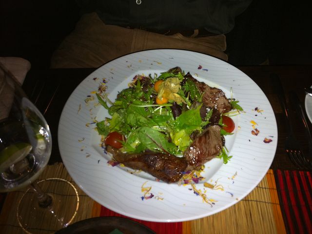 Boerewors Südafrikanische Bratwurst Handwarme Sußkartoffeln mit Ricottakäse,  gebratenen Springbockstreifen, Kirchtomaten, Pinienkernen und Mangodressing