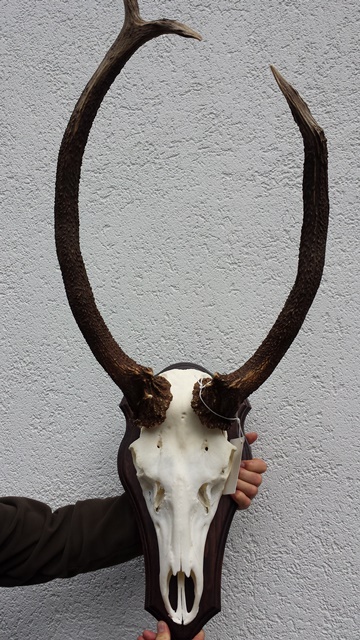 | Perückenbock Präparat männlciher Rehbock mit Hornmissbildung durch Hormonstörung Ausfall Testosteron nicht mehr Hornbildung möglich |