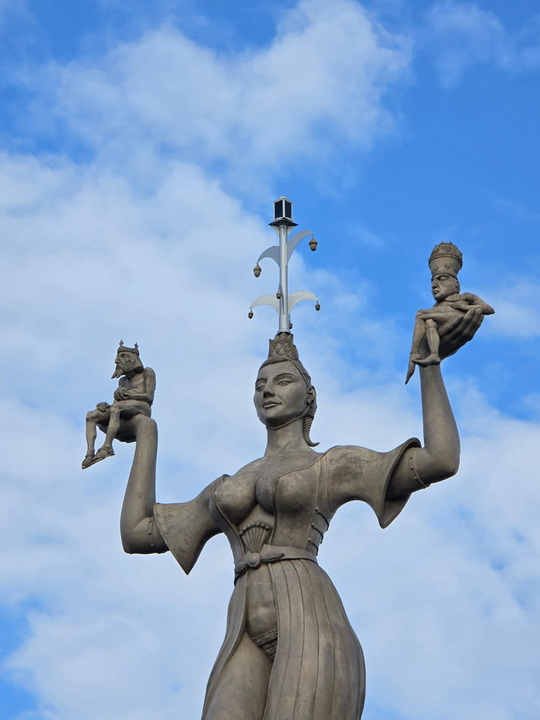 Auf ihren ausgestreckten Händen hält sie zwei zwergenhafte, nackte Männchen: eine Figur mit Kaiserkrone und Reichsapfel (weltliche Macht) und eine mit Papsttiara (geistliche Macht) Das Konstrukt steht auf einem Drehtisch, der sich einmal alle vier Minuten um die eigene Achse dreht