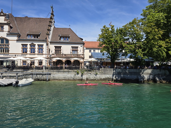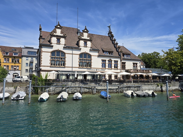 | Mit Boot zurück nach Konstanz auf dem Rhein Bodensee Rheinterasse | Mit Boot zurück nach Konstanz auf dem Rhein Bodensee Constanzer Wirtshaus |