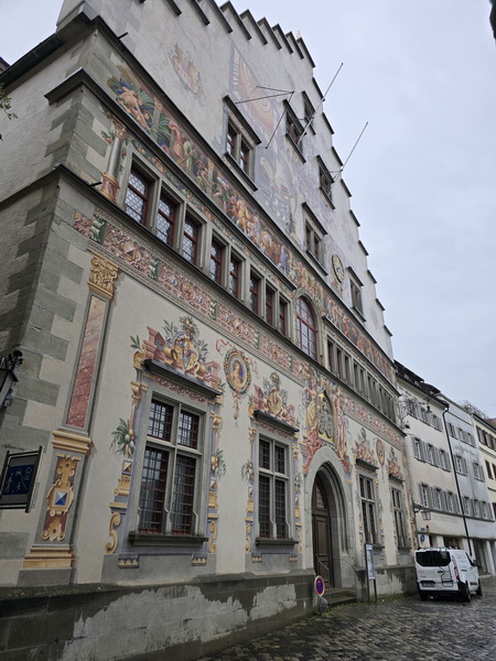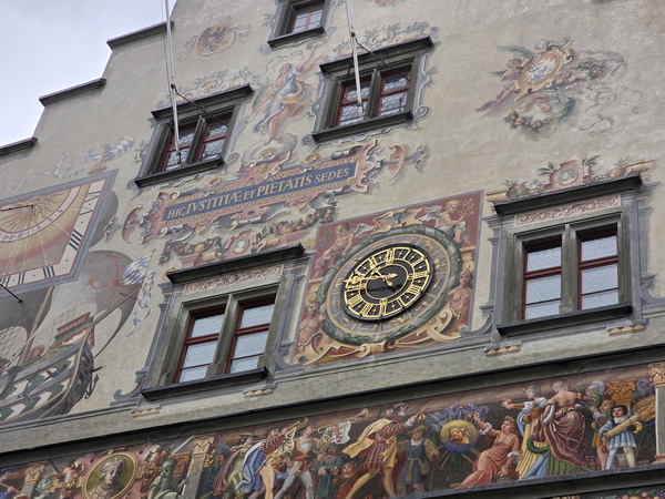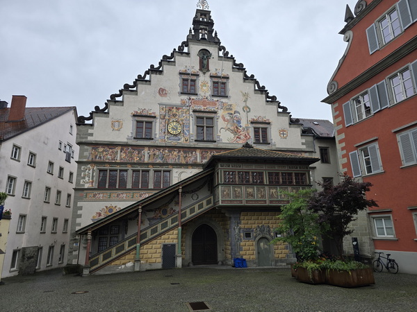 • Die Südfront beeindruckt mit aufwändiger historisierender Fassadenmalerei aus dem 19. Jahrhundert, die Szenen aus Lindaus Geschichte erzählt. Diese wurde umfassend 1972–1975 renoviert
