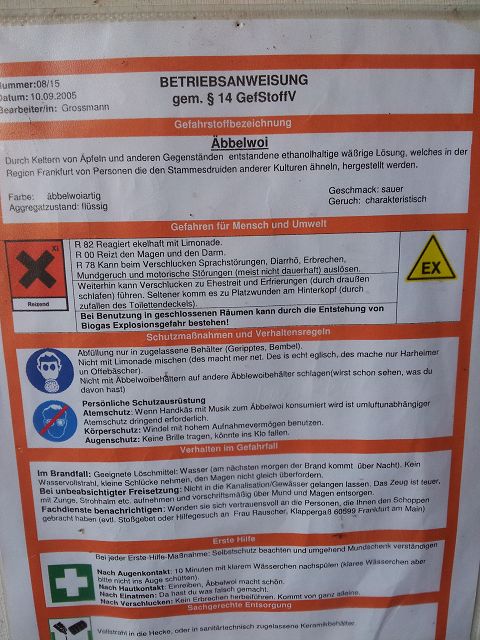 | Äbbewoi Betriebsanweisung Gefahrstoffverordnung apfelwein Saurer Most | Oberjosbacher Apfelwein-Kelter Apfelmost Viez 5,5 bis 7 %. Apfelwein hat einen herben, sauren Geschmack. Ebbelwoi, Äbbelwoi, Ebbelwei , Stöffsche |