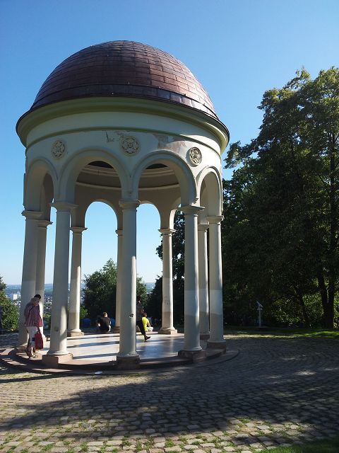 NerobergInnerhalb der Stadt zählt der Neroberg, der Hausberg Wiesbadens, zu einem der beliebtesten Ausflugsziele. Die 245 Meter hohe Anhöhe, auf der auch der Neroberger Wein unter Obhut der Hessischen Staatsweingüter gedeiht, bietet viele Freizeitmöglichkeiten. Der runde Neroberg-Tempel wurde 1851 von Philipp Hoffmann errichtet. In der Nähe gibt es eine so genannte "Erlebnismulde" für Kleinkunstaufführungen und ein Ausflugscafé. |