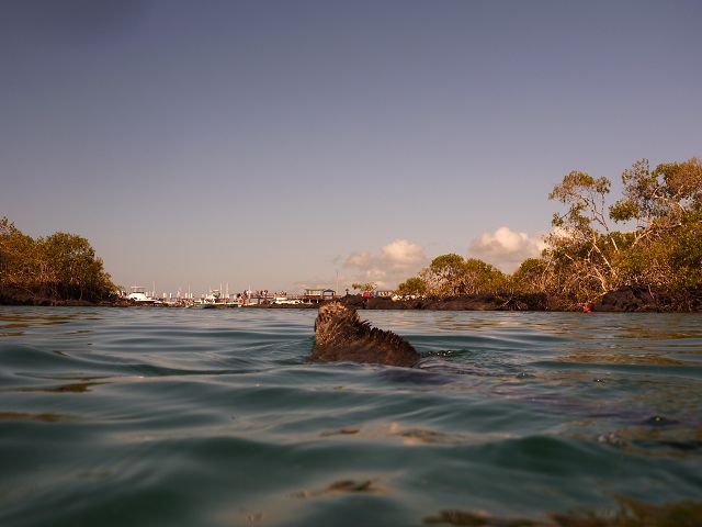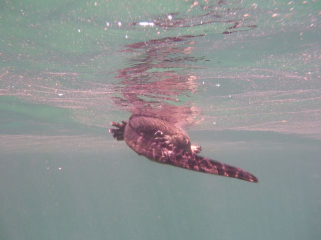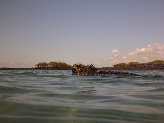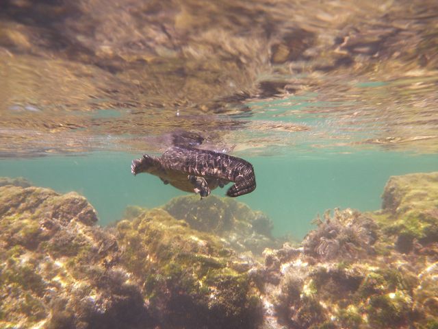 | Meeresechse beim Schwimmen über der Wasserlinie aus gesehen | Meeresechse beim Schwimmen unter der Wasserlinie aus gesehen |