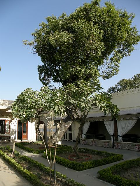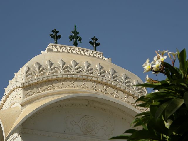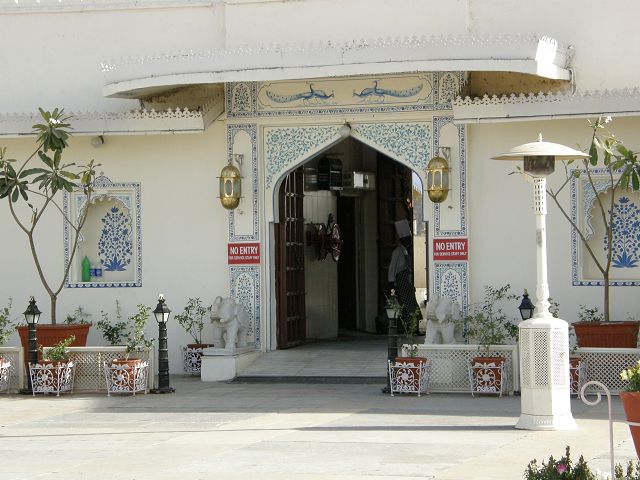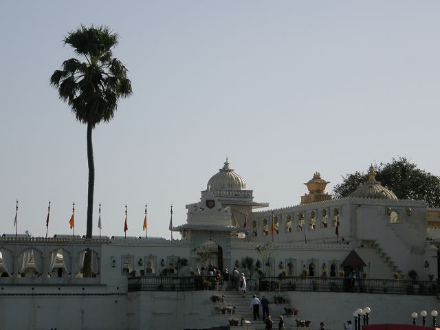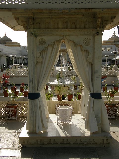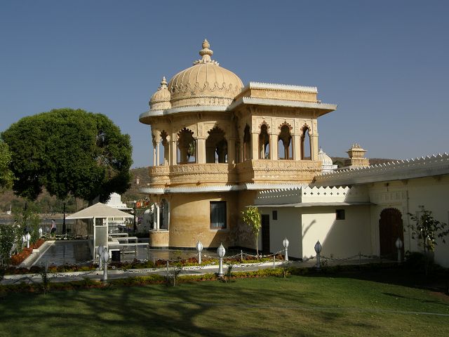 europäische Frauen und Kinder. Die Kuppel des dem Stadtpalast zugewandten Hauptgebäudes ist mit detailreichen Steinintarsien verziert. Im Zentrum des Gartens vor dem Gebäude, der von Steinelefanten bewacht wird, steht ein chhatri aus grünen Marmor, dessen Verzierungen Weinreben und Blumen zeigen. Abgesehen von den Vogelscharen sind die einzigen Bewohner des Jag Mandir drei Diener, die mit der Pflege der Gartenanlagen und Aufzucht der Blumen für die Feiern des Maharana betraut sind. |