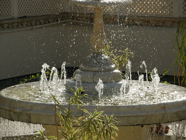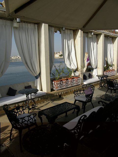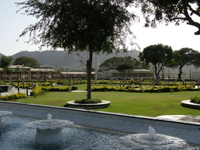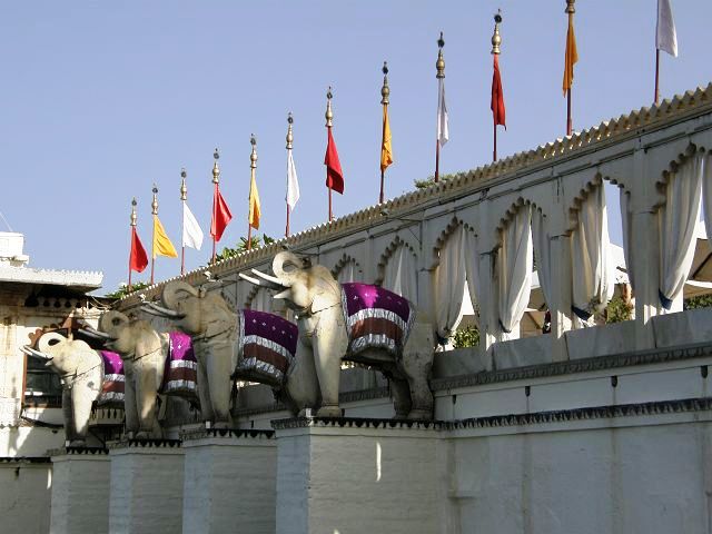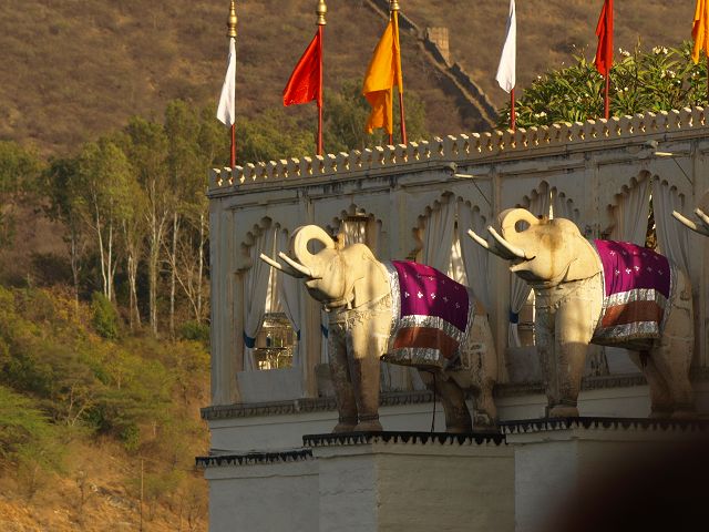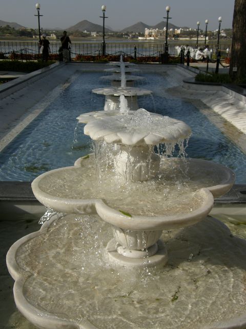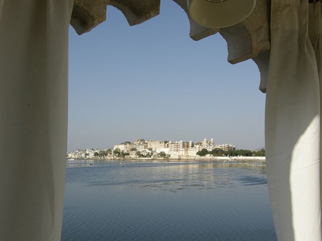 Bootsfahrt zur Lustinsel Jag MandirDie Runde entlang des Ufers unterhalb des Stadtpalastes ist nett und vermittelt uns, warum Udaipur auch Venedig des Ostens genannt wird. Wir sehen Tempel unter Bäumen dicht am Wasser, Pavillons und so etwas wie das Strandbad. Hier plantschen die einheimischen Jungs und waschen die Frauen. Ziel, die Lustinsel Jag Mandir. Das Eiland ist äußerst winzig. Springbrunnen und ein paar Gärten mit Rosen. Aber es gibt oberhalb des Lokals eine Balustrade mit hübscher Aussicht auf das Ufer und auf die großen, weißen Marmorelefanten, die die Anlegestelle bewachen