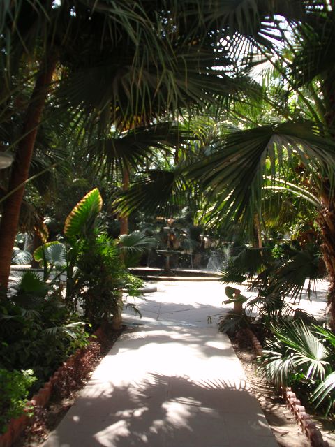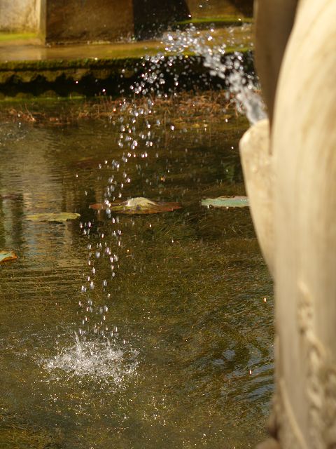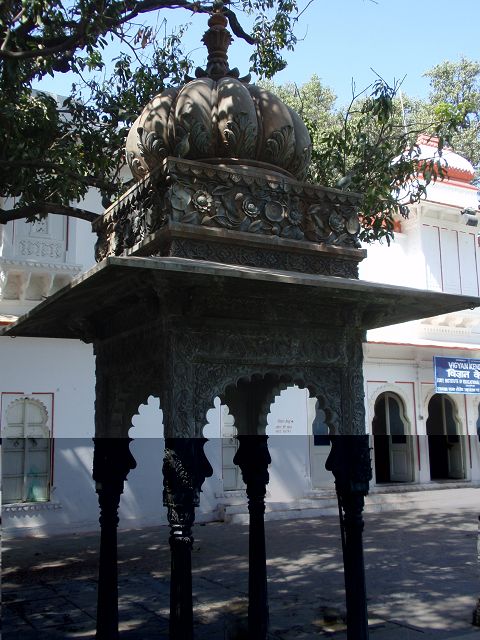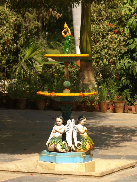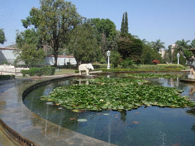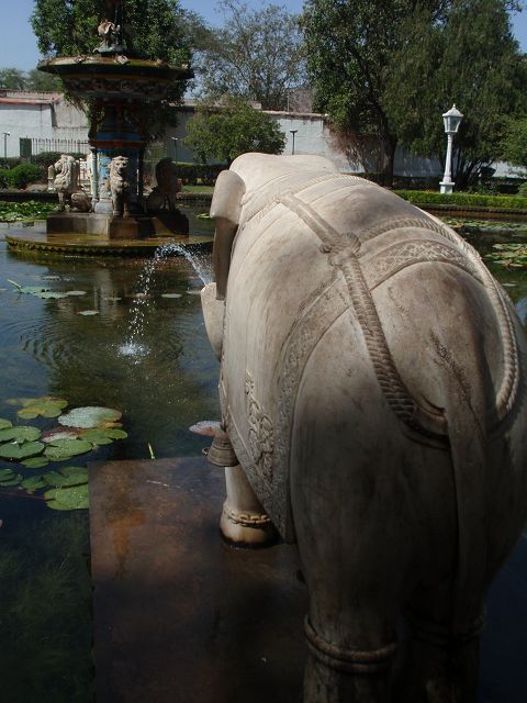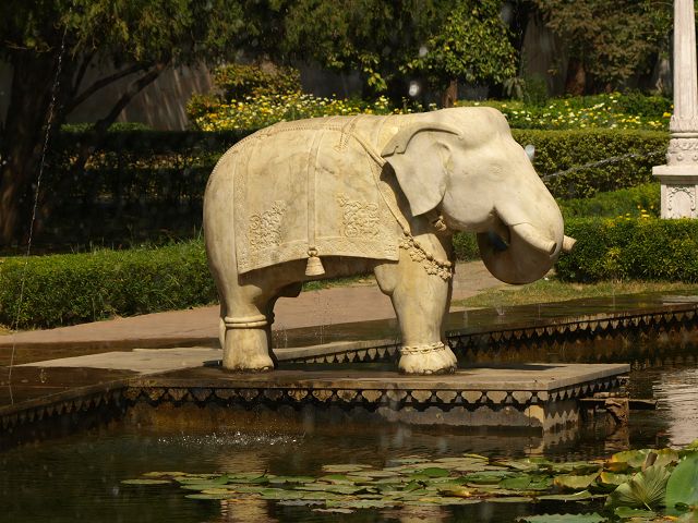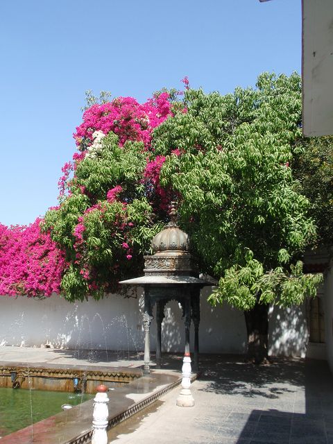 Sahelion-Ki-Bari Bagh Garten + Swimmingpool für die PrinzessinenDie goldenen Maske des Sonnengottes Surya dominiert wird. Die Herrscherdynastie von Udaipur behauptet von ihm abzustammen.Schließlich bedeutet der Name Udai auch Sonnenaufgang. Unterhalb des Sonnengesichtes sind viele detailreiche Reliefs mit paradiesischen Szenen zu bewundern. Mann tritt durch ein weiteres Tor und findet ein großes Becken aus weißem Marmor vor. Es ist umgeben von hohen Mauern, um die Prinzessin und ihre Hofdamen beim Baden einst vor neugierigen Blicken zu schützen. Bougainvillea und gelbe Trompetenblumen ranken sich über die Mauern und an den Türmchen aus schwarzem Marmor. In der Mitte des Pools dreht sich ein steinerner Vogel über einer schmiedeeiserne Mädchenstatute, die auf das bunteste bemalt ist und ziert einen kleinen Springbrunnen. Die Wassertropfen glitzern und funkeln in der Sonne, bevor sie auf den Grund des Beckens niederfallen. Rund um den abgeschirmten Swimmingpool ist ein kleiner Park angelegt. In einer Ecke befindet sich ein so genannter Monsunbrunnen. Hier plätschert unaufhörlich Wasser auf die großen Blätter von Fächerpalmen und erzeugt so den Eindruck, als würde gerade sanfter Monsunregen fallen. Etwas weiter hinten im Park finden wir einen großer Brunnen mit 4 Marmorelefanten. Seine Oberfläche ist über und über mit rosa Lotosblumen bedeckt, die ihre geöffneten Blüten der Sonne entgegenhalten. Gegen 10 Rupies dreht eine Frau das Wasser auf, so daß wir die Fontänen in all ihrer Pracht bewundern können. |