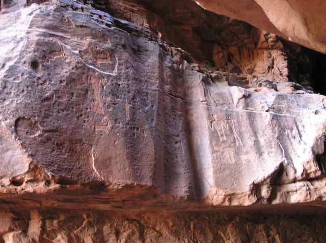 Wadi Rum Beduinenzeichnungen( gemeißelt) Steinböcke und Menschen ( ähnlich den Buschmannzeichnungen aus dem südlichen Afrika )