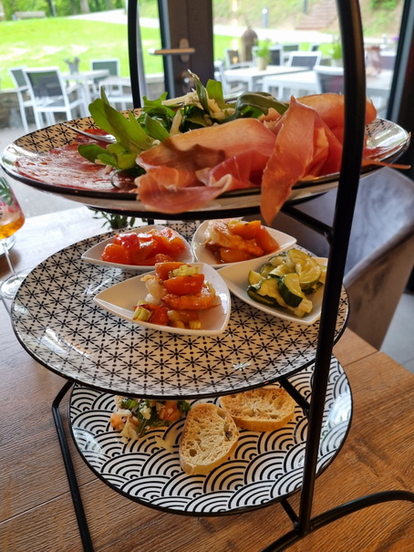| Kais restaurant Schloss Homburg Finger Food: Roastbeef mit Rucola, Chorizo, Oliven, italienisches Gemüse mit Knoblauch, Scampi auf Staudensellerie, Bruschetta mit Tomaten und Basilikum, Bärlauch-Aioli mit Radieschen / | Kais restaurant Schloss Homburg Vorspeisen-Etagere |