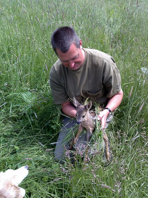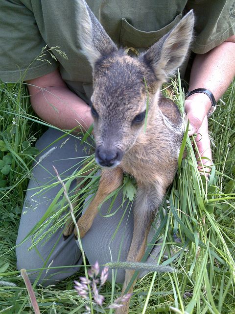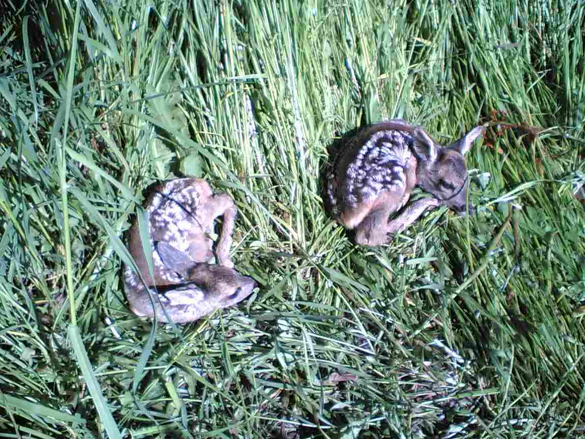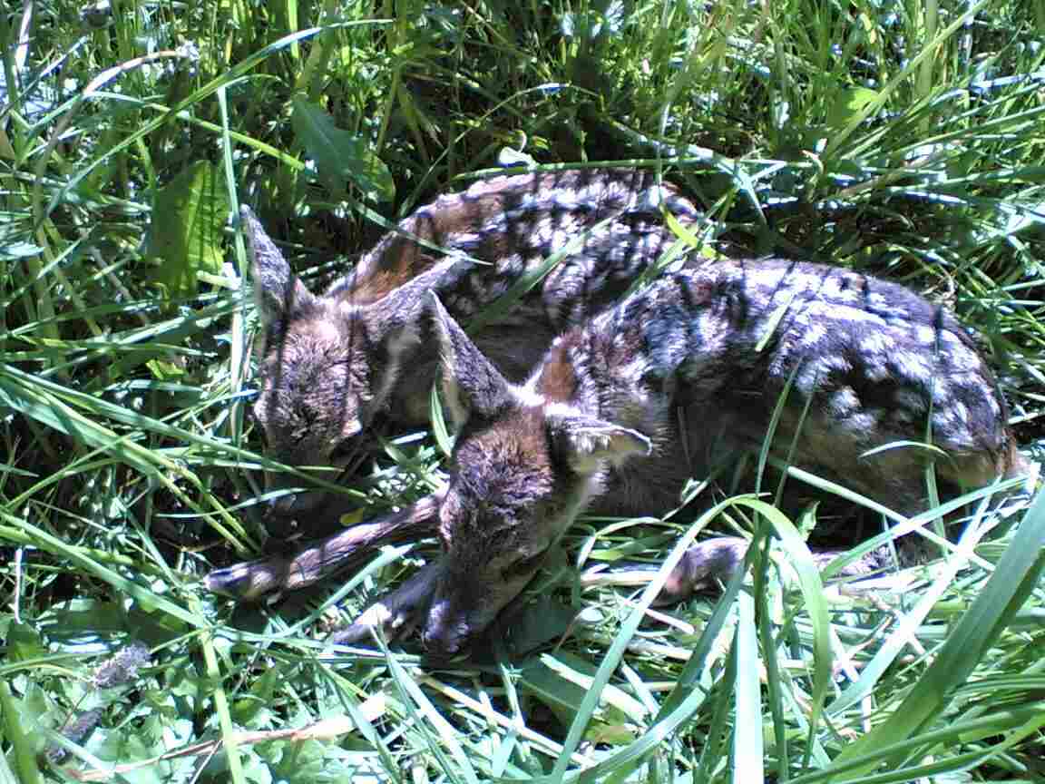 Die beiden Kitze wurden kurz vorher gesetzt , die Placenta lag noch daneben im Gras und die Ricke hatte aus dem Spiegel ein Stück Nabelschnur anhängend. Rehkitze suchen im Gras | |