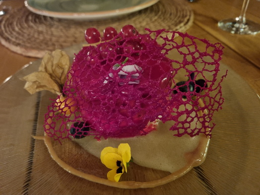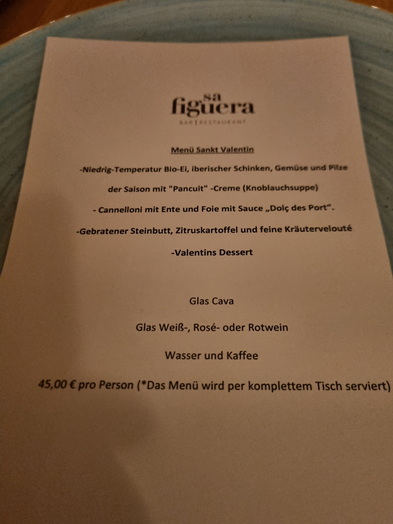 Hotel Es Port Restaurant Sa Figuera Menu del Valentina Dia  Niedrig Temperatur Bio Ei Iberischer sschinken gemüse Pilze der Saison Pancuit Creme Knoblauchsuppe Hotel Es Port Restaurant Sa Figuera Canneloni mit Ente Und Foie demit Suace Dolc des Port