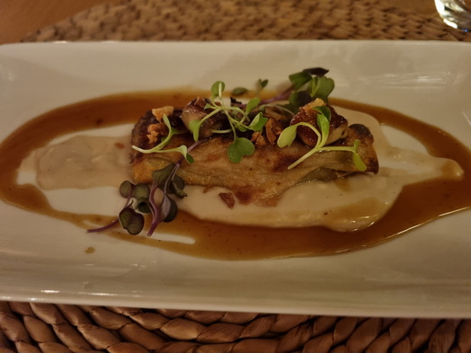 Hotel Es Port Restaurant Sa Figuera Menu del Valentina Dia  Gebratener Steinbutt  Zitruskaroffel + feine Kräuterveloute Hotel Es Port Restaurant Sa Figuera