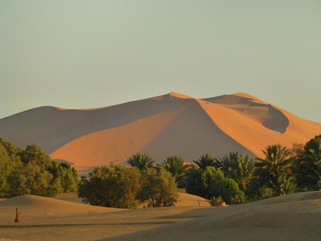 7. Tag – Die Sahara Möglichkeit zu einem traditionelle Lehmbauweise. Möglichkeit zu einer Dünenwanderung + Kamelritt in die Oase. Übernachtung in Merzouga in der  Merzouga: Kasbah Mohayout (Standard Zimmer)