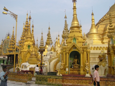 Buddastatuen und weisse Elefanten und Schreine