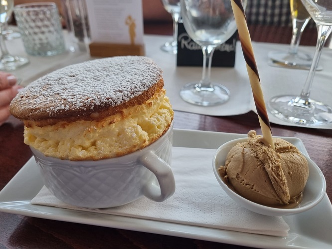 | Kokosmilch-Currysuppe mit Sesamstange | Attenbacher Köppchen Passionsfrüchte-Soufflé mit Kaffeeeiscreme |