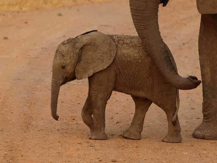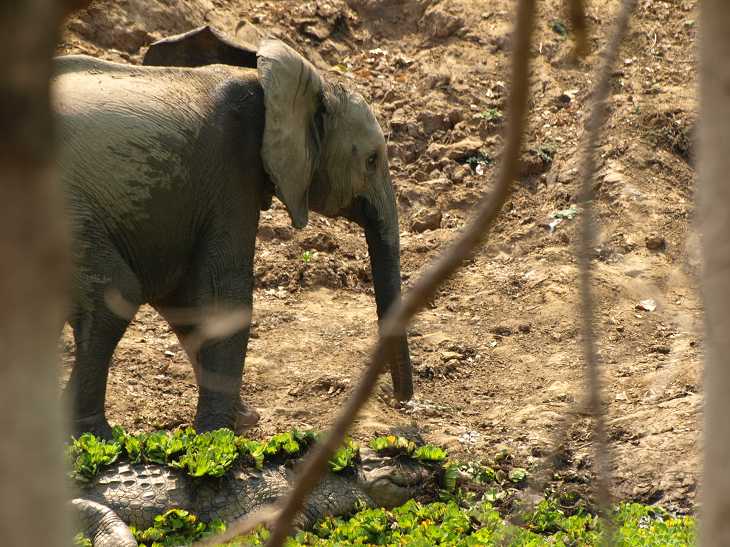 | die unheimliche Begegnung passiert am Nsefu Lodge Wasserloch | ein junger Elefant trinkt am Wasserloch und kommt einem gut getarntem Croc näher |