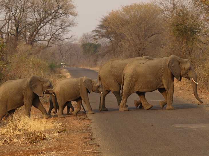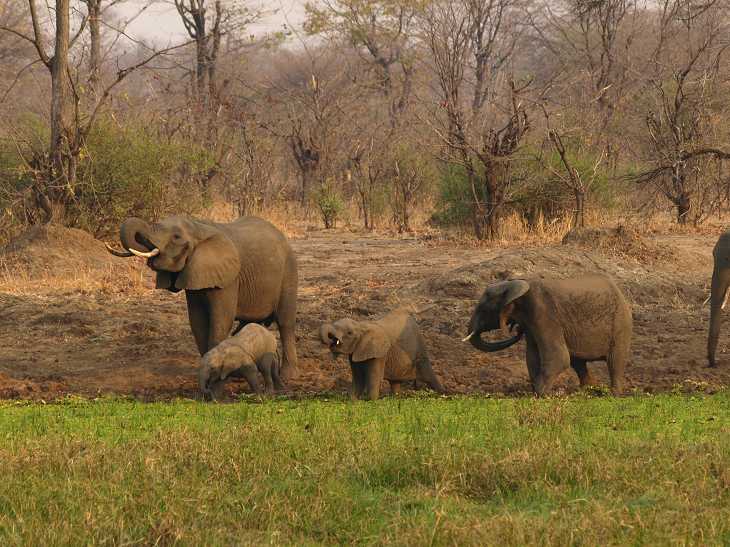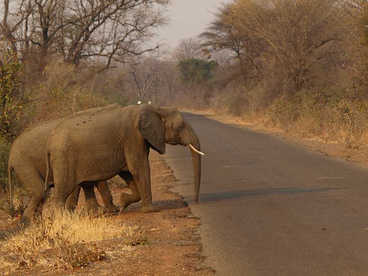 | Die Elefanten kommen aus dem N.P. und gehen mal gucken was in den Gärten des Orte Mfue wächst | die stören sich gar nicht an den Menschen |