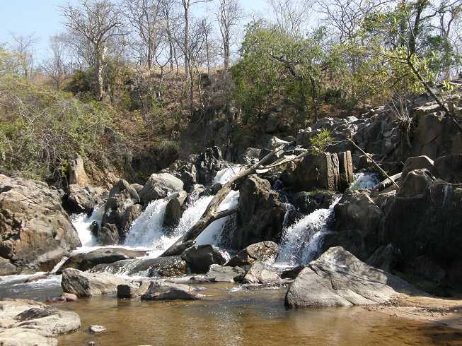- The waterfall is set in a stunning natural environment, surrounded by lush forests and the rugged landscape of the Luangwa Valley. The falls themselves drop over a series of rocky ledges, creating a dramatic scene.