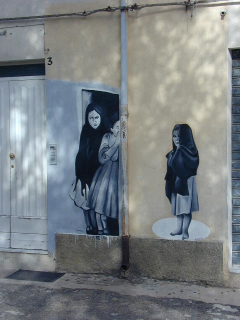 Murales Wandgemälde in Orgosolo Sardinien Wallpictures Orgosolo Sardinia Kind mit Umhang