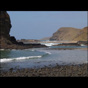 surrounding cliffs. The beach is perfect for relaxation, with golden