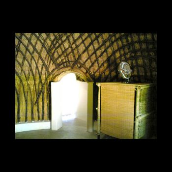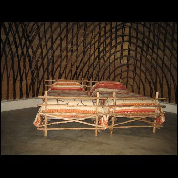| Mlilwane Beehuts Bienenkorb hotel | Mlilwane Beehuts Bienenkorbhotel Innen glatter Boden ein Doppelbett und Kleiderschrank und der Durchgang zum gemauerten Badezimmer |