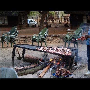 | Mlilwane Beehuts Von aussen wie eine Bienenkorb für Riesen 12 Häuschen im Kreis , in der Mitte Grillplatz Braai | Mlilwane Beehuts Bienenkorbhotelbetten |
