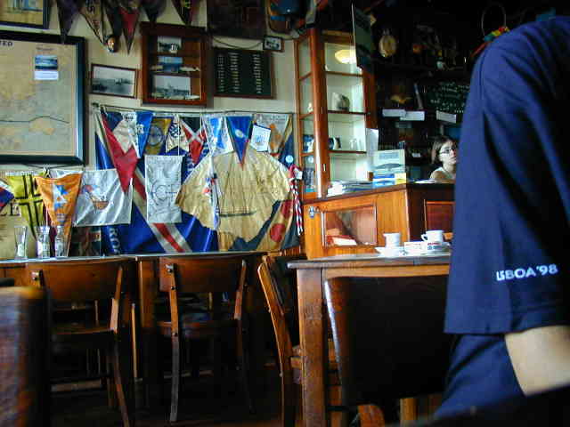 dient weiterhin als inoffizielle Poststation für Transatlantiksegler . Das Café ist bekannt für seine maritime Atmosphäre, die von Wimpeln, Flaggen und Schiffsdekorationen geprägt ist. Besonders berühmt ist der Gin Tonic, der als Spezialität des Hauses gilt. Außerdem sollte man unbedingt den Schokoladenkuchen probieren, der bei Stammgästen sehr beliebt ist . |