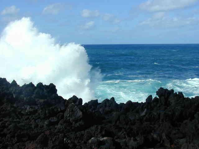 Wellen bei Ferreira Ponta da Ferraria Ufers Basaltfelsen Piscina naturale di Ferreira Naturschwimmbad mit Thermalwasser