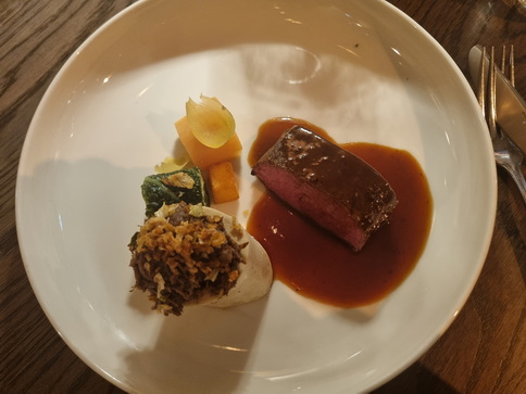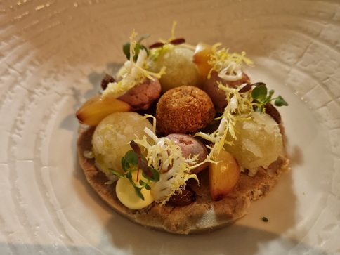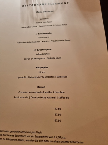 Hotel Kasteel Bloemendal Menü Clermont Rillette vom Fasan  Gänseleber Creme Sauerkrautsalat Erdnuss - kekse Hotel Kasteel Bloemendal Limburger Hirsch Spitzkohl Sauerbraten vom Hirschrücken und Wildsauce