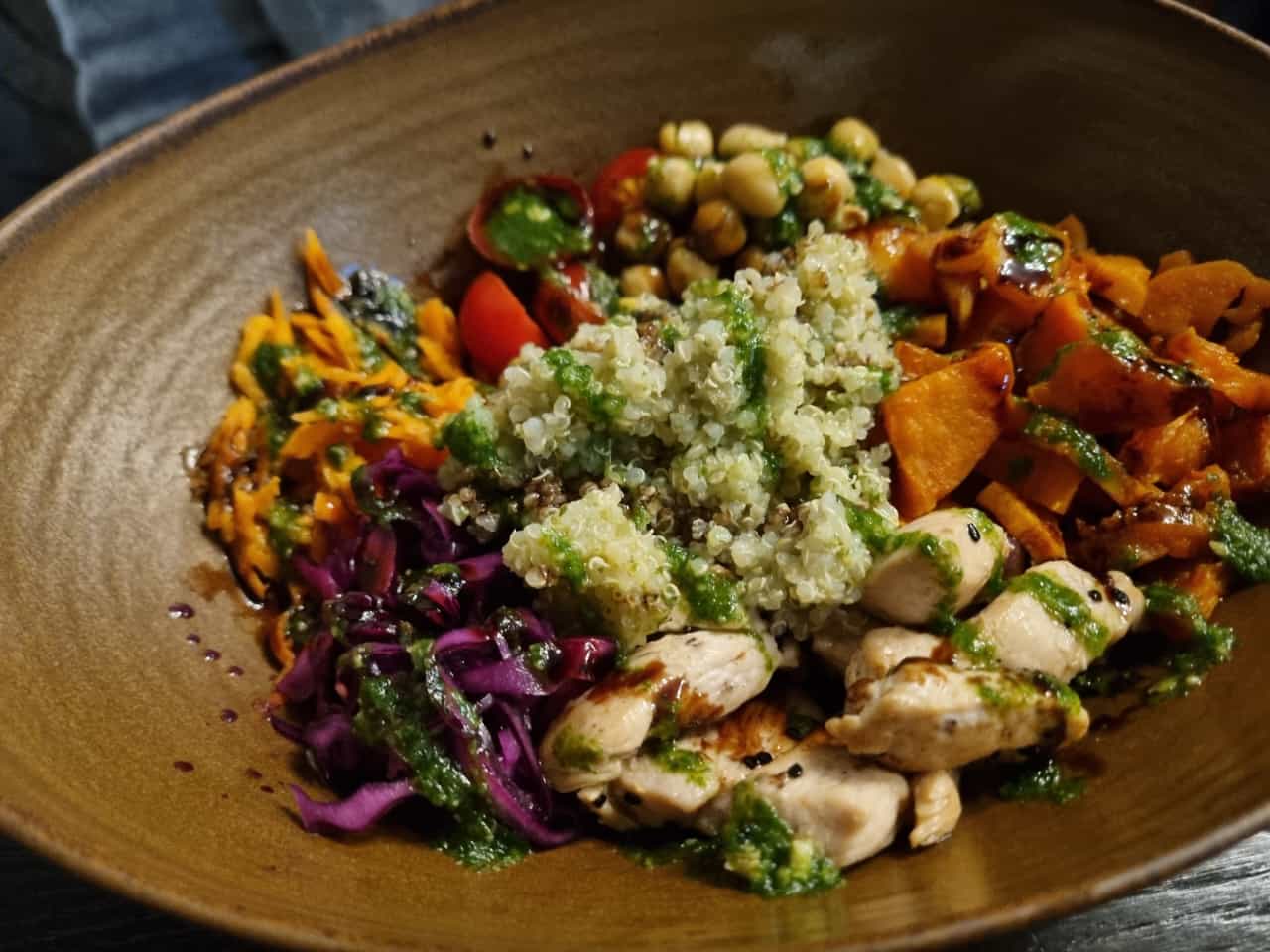 GEMÜSE-BOWL Quinoa I gebratene Süßkartoffel I Rotkohl I Honigkarotten I Kichererbsen I Tomaten I Kokos-Curry-Sud I + Sesamhühnchen |
