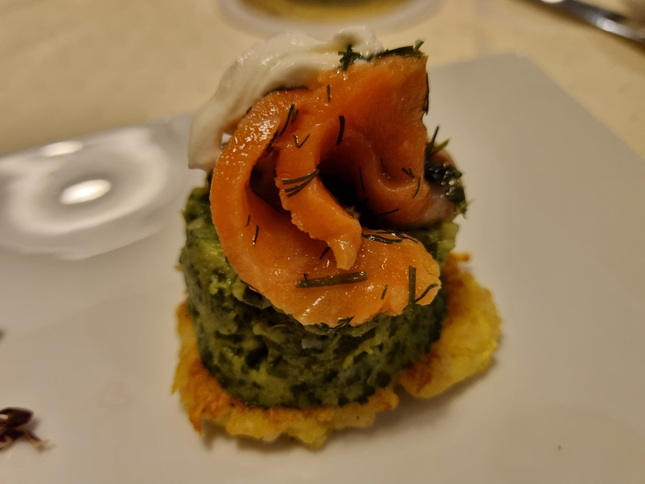Grünkohlflan auf Pillekuchen dazu Lachs miin Wodka Holunderblüte gebeizt |
