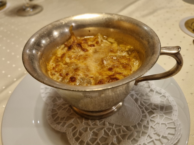 Französische Zwiebelsuppe mit Croutons und Käse überbacken |