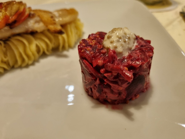 belegt Senfkörnerslasa Kartoffelüree in Tannenzapfenform |