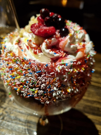 BLAUBEEREIS, HIMBEEREIS, ERDBEEREIS, SAHNE, ERDBEERSAUCE, WALDBEEREN & BUTTER-CRUMBLE