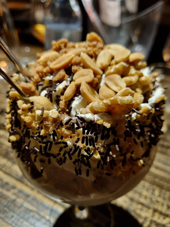 SALZIGES ERDNUSSEIS, VANILLEEIS, SCHOKO-NUSS-EIS, SAHNE, KARAMELLSAUCE, KARAMELL-CRUMBLE, SCHOKOSTREUSEL, ERDNÜSSE & MINI-SNICKERS