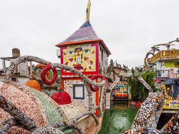 Nachdem er 1975 in ein bescheidenes Holzhaus im heruntergekommenen Viertel Jaimanitas außerhalb von Havanna eingezogen war, begann Fuster damit, sein Atelier mit farbenfrohen Mosaiken auszustatten. Als er dort fertig war, fragte er seine Nachbarn, ob er auch ihre Häuser und Geschäfte dekorieren könne. Einige wenige nahmen sein Angebot an, und die Fliesenkreationen wuchsen. Im Laufe eines Jahrzehnts wurden Arztpraxen, Bushaltestellen, Brunnen, Bänke, Tore und vieles mehr von Fusters skurriler Fantasie umhüllt. Heute überzieht sein Kunstwerk die Nachbarschaft mit einem Regenbogen seltsamer, bezaubernder Phantasie.