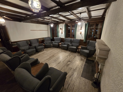 | Kammerbacher Pirschhaus 10 Schlafplätze betten + reserve | Kammerbacher Pirschhaus 2 Forst Hütten Kaminsesselrunde |