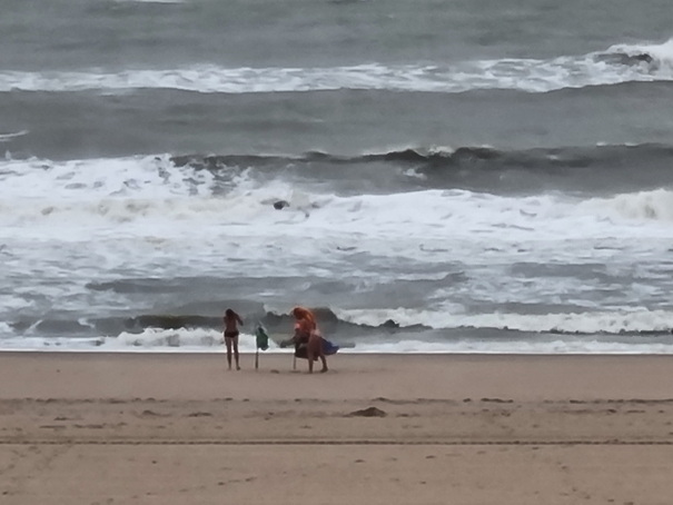 Stranblick die jeden Morgen Badewütigen bei Wind regen Sturm in de Zee