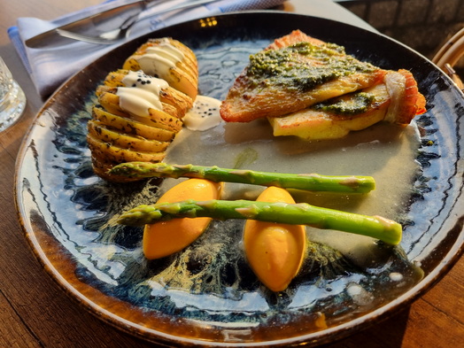 | Holland Ostern 23 Scheveningen Paasdag Dagvisser das Fischrestaurant 4 Gangen Paasmenue | Holland Ostern 23 Scheveningen Paasdag Dagvisser das Fischrestaurant Tarte vom Aal auf Tzaziki Broche Granny Smith Apfelstücke |