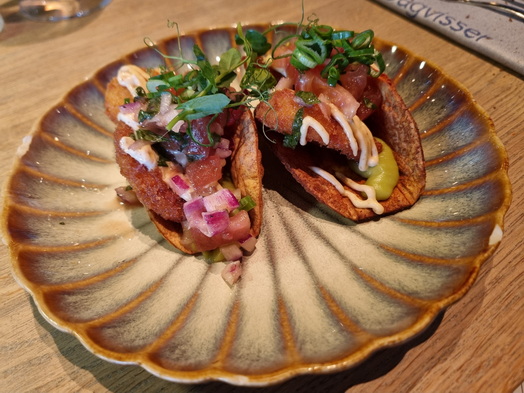 | Dagvisserrestaurant Leyklade | Dagvisserrestaurant Leyklade 2 Taccos mit Gambas und Tomatensalsa |