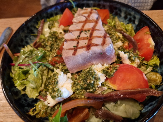 | Dagvisserrestaurant Leyklade Tarbot Zwiebelkompott | Dagvisserrestaurant Leyklade Caprese mit Tuna gegrillt |