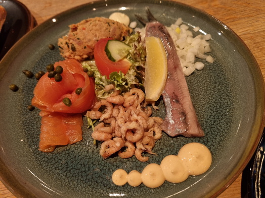 | Dagvisserrestaurant Leyklade Vorspeiseplatte 4 mal Fisch geräuchterter Zalm = Lachs Hering Makrelensalat Hölländische Krabben | Dagvisserrestaurant Leyklade Schevenings Rondje |