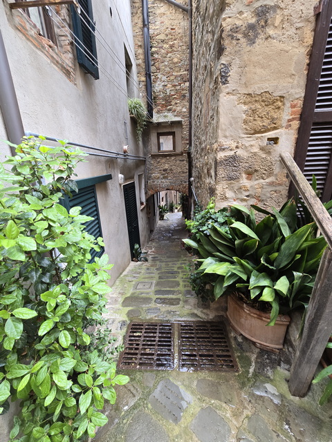 | Castagneto Carducci grosses weinbergdorf Kirchenkuppel Chiesa del Santissimo Crocifisso | Castagneto Carducci steile enge Gässchen und Treppen |