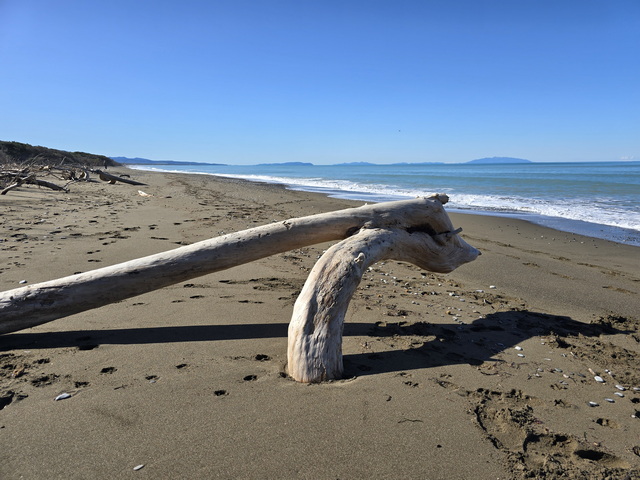 | Park Hotel Marinetta Beach Wanderung am Strand nach cecina cecinabeachwalk Hund aus Holz blickt nach Capraia Dogbeach Hundestrand | 2 Schiffe vor Cecina Wanderung bis cecina beachwalk |