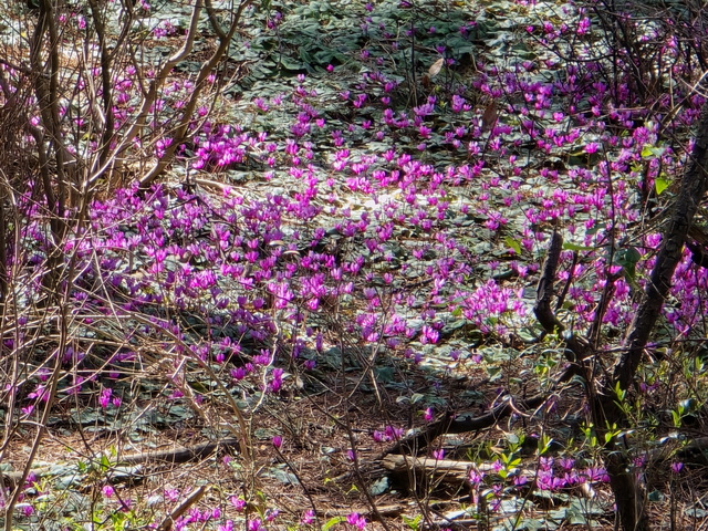 | waldboden voll Lila Blumen Frühlings Alpenveilchen Cyclamen coum Alpenveilchen oder Zyklamen (Cyclamen) | küstenpinien Kiefern wald Küste Toskana Fossi della Madonna Fosso delle Tane |