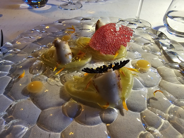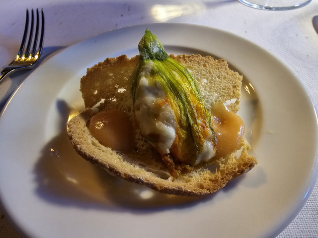 | Ristorante Anfora Di Baratti Ei pochiert mit Kürbisblüten auf Brot | Ristorante Anfora Di Baratti Kalamar mit Büffelmilchricotta den tentakeln und Mazzancoller gefüllt auf Porree Kartoffelpüree |