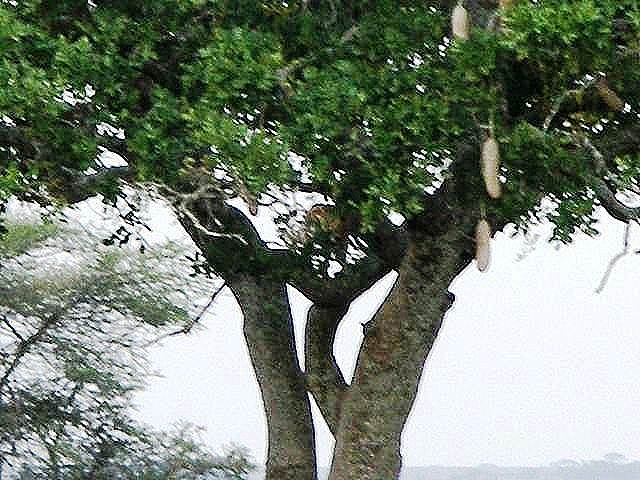 | Leopard liegt auf der Astgabel im Leberwurstbaum | Leberwurst-Leopard |