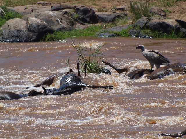 | reich gedeckter Tisch gnus im Mara River Geier Weißrückengeier | |